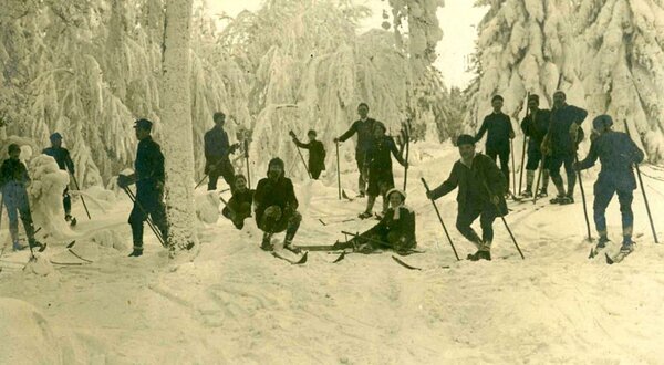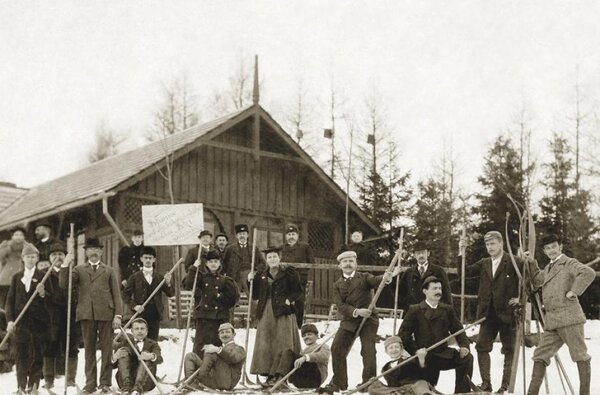 První dochovaná fotografie lyžařů v Čechách. Lyžníci z Horní Branné na výletu 7. 5. 1893.